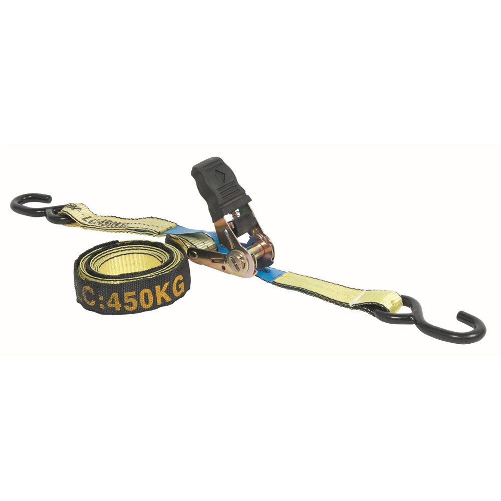 349025BRSB Heavy Duty Ratchet With New Rubber Grip. Fitted with 5m x 25mm webbing and Black Vinyl coated. “S” Hooks c/w Protective Sleeves. LC 450 Kg 0.8 Each 6