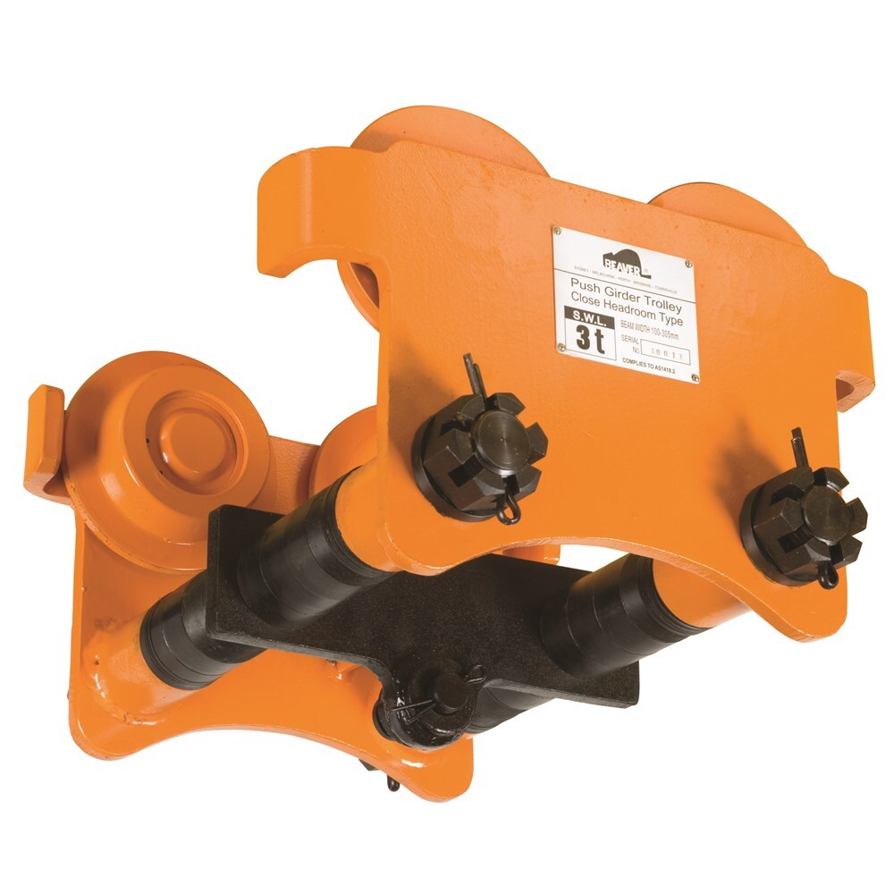 Beaver push girder trolleys are fully adjustable to suit varying flange widths up to a maximum of 350mm with the simple addition or subtraction of spacers or nuts on a suspension pin, and are designed to suit 3S chain blocks. This trolley complies to AS 1418.20.