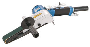 The heavy duty belt sander with 30mm wide belt, also featuring a wheel guard cover and a fail-safe throttle that prevents unintended start.