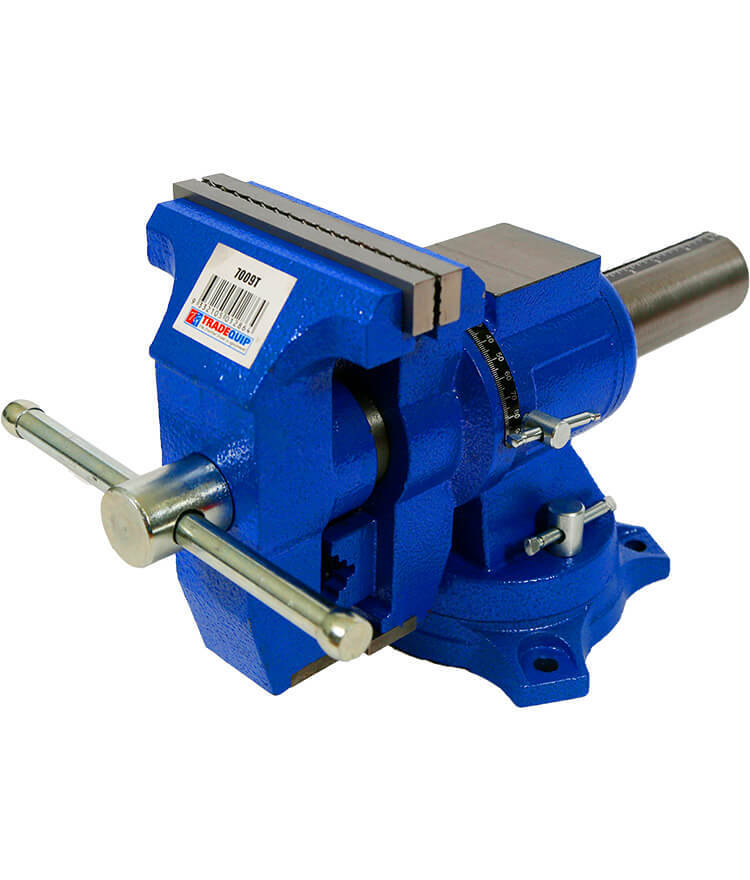 Constructed of ductile iron, the TradeQuip “Made for the Trade”  Multi Purpose Bench Vice range is designed with rugged thick malleable cast body and precision machined jaws, ideal for medium duty work. With a swivel base, the vice body and jaw angle can be rotated to offer full flexibility for holding long and/or awkward working pieces. Our TradeQuip “Made for the Trade” Multi-Purpose Bench Vices do it all. Jaws rotate 360° for unlimited work piece positioning and clamping flat, as well as round stock (with the built-in pipe jaws). The 360° rotating head clamps material at any angle and the  90° left and right indexing offers quick set up as well as permanent pipe jaws and a v-jaw to hold round objects vertically.