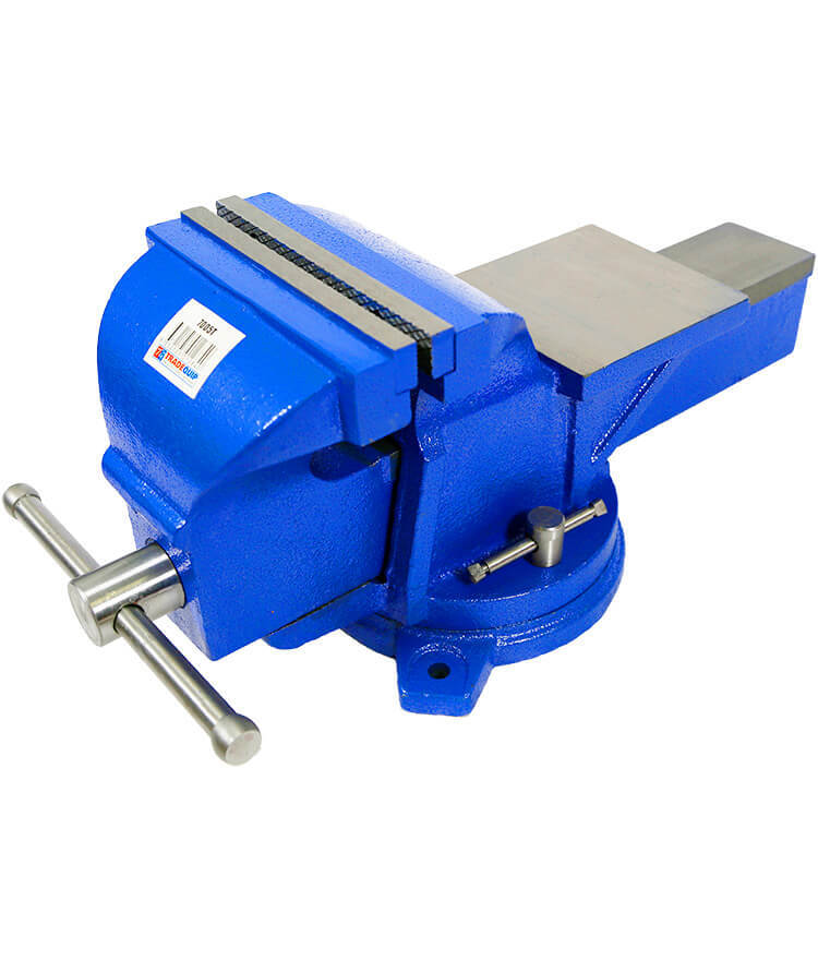 Toughened quality malleable cast iron body with a machined steel screw and handle, this TradeQuip “Made for the Trade” Engineers Bench Vice has forged steel serrated jaws to provide a sure grip and keep your workpiece steady. A large hardened anvil work surface is perfect for shaping and fabrication work. The robust swivel base offers flexibility for efficiency and a large machined centre slide keeps jaws precisely aligned under maximum clamping pressure.