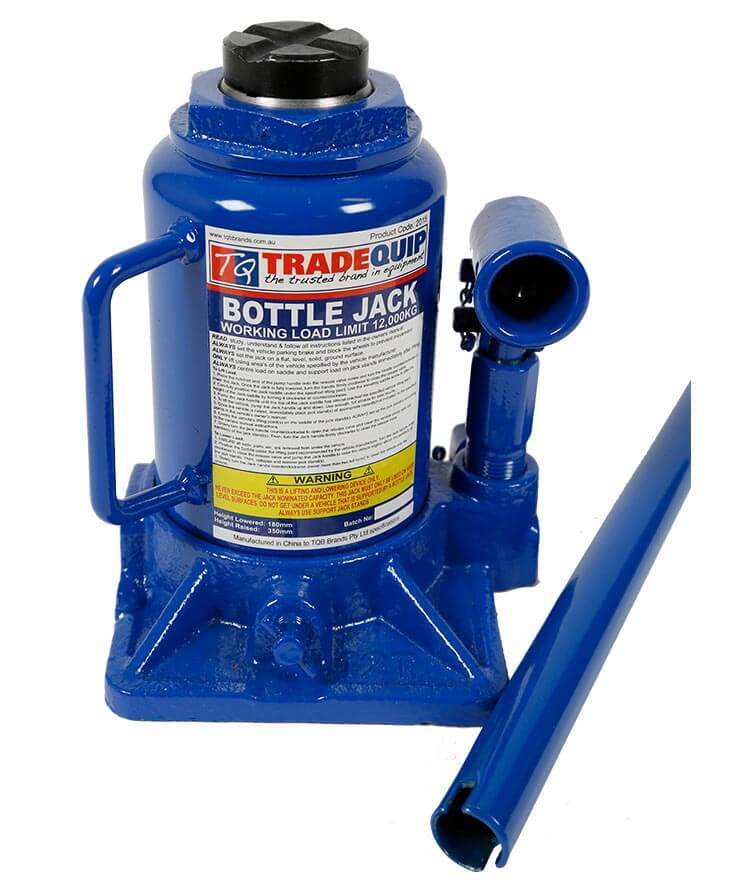 This powerful, heavy-duty TradeQuip "Made for the Trade" Hydraulic Bottle Jack with high quality glide-action pressure pump is designed for hard-hitting commercial use, making large loads easy to lift. The lightweight jack is ideal for lifting farm vehicles, heavy-duty machinery, industrial construction equipment and more. Professional quality, ideal for the workshop or panel shop. Fitted with unique overload protection system and large stable base. Supplied with 500mm pump handle. The low profile design of this hydraulic jack fits underneath tight spots. The jack drops down to just 180mm at its lowest point, making it ideal for use in automotive and ag repair shops, and other small spaces.