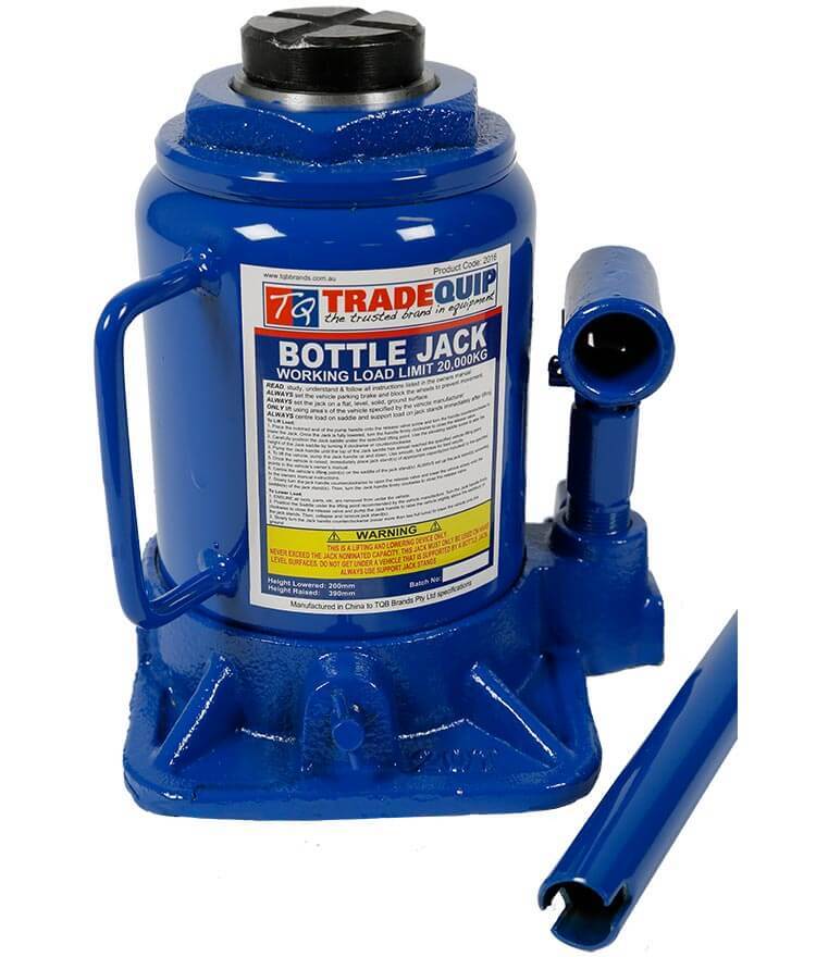 This powerful, heavy-duty TradeQuip "Made for the Trade" Hydraulic Bottle Jack with high quality glide-action pressure pump is designed for hard-hitting commercial use, making large loads easy to lift. The lightweight jack is ideal for lifting farm vehicles, heavy-duty machinery, industrial construction equipment and more. Professional quality, ideal for the workshop or panel shop. Fitted with unique overload protection system and large stable base. Supplied with 500mm pump handle. The low profile design of this hydraulic jack fits underneath tight spots. The jack drops down to just 200mm at its lowest point, making it ideal for use in automotive and ag repair shops, and other small spaces.
