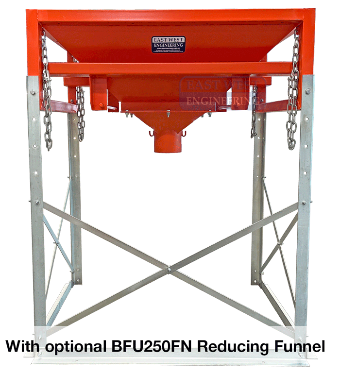 The BFU250 Bulk Bag Filling Frame saves hours of labour and reduces risk of injury. This frame is designed to safely hook open a bulk bag and fill with free-flowing bulk products such as sand and gravel etc, removing the need for the operator to hold the bag open or manually fill themselves.