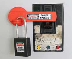 Use for: Locking out larger Circuit Breakers by blocking the toggle. Permanently attached to escutcheon plate.