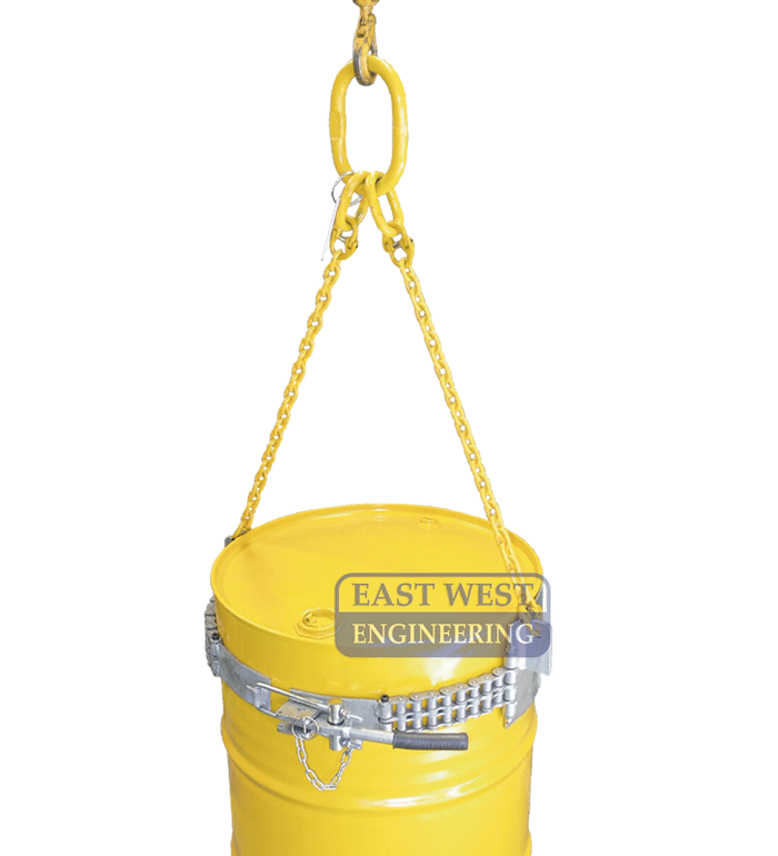 The CDC-1 Crane Drum Clamp is a safe yet simple solution to moving drums about the workplace/site by overhead crane. The chain belly strap with ratchet tightening allows clamping of standard 205 litre steel drums.