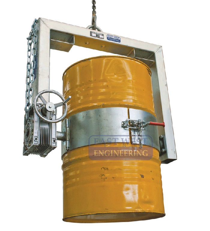 The DBR40H Drum Rotator is designed to lift and rotate a 205 litre steel drum 360° by overhead crane or forklift. Rotation of the drum is controlled throughout the operation by the handle driven gearbox which locks the drum in position when the operator stops turning the handle, preventing dangerous and uncontrolled movements.