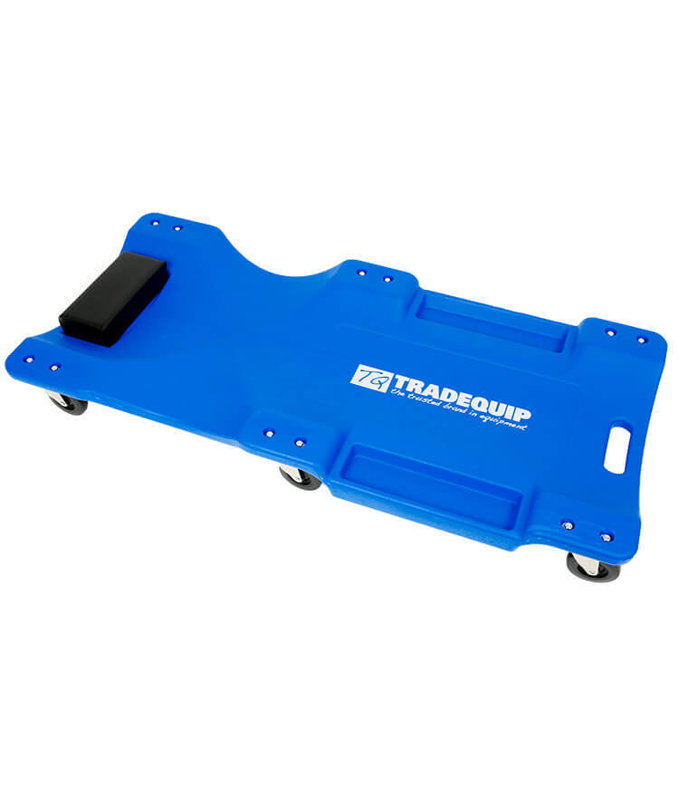 The TradeQuip "Made for the Trade" low profile moulded mechanics creeper comes complete with 6 x 75mm high quality swivel castors for easy manoeuvring. This creeper is equipped with a thick padded cushion headrest for extra comfort  and two convenient side moulded tool trays. This trade quality model is moulded from tough high impact polymer, features comfortable ergonomic shoulder recesses and an integrated carrying handle.  Glide just 100mm above the ground in this lightweight low-riding mechanics creeper. The durable rubber/nylon offset-centre castors with ball-bearing swivelling wheels roll smoothly across the workshop floor and turn easily for ultimate maneuverability.