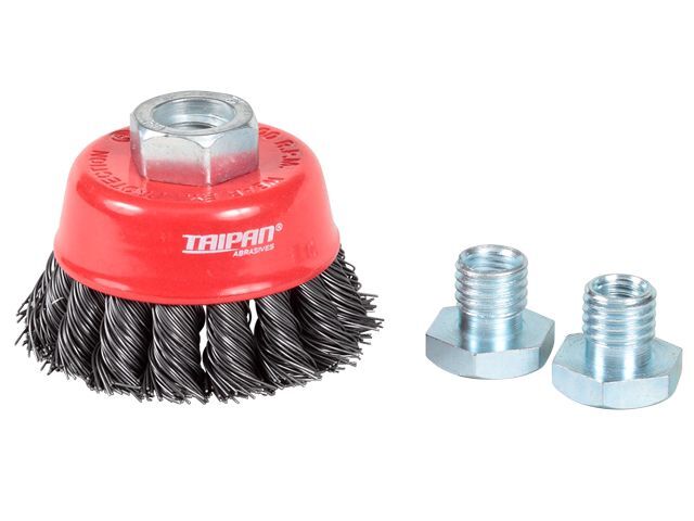 Wire cup brushes in 65mm and 75mm for angle grinders. Twist-knot wire for aggressive removal of rust, scale, burrs, etc. Available in mild steel and stainless steel. Manufactured to a high standard for demanding industrial use. Multi-thread design: M14x2 thread to suit most angle grinders 115mm & larger... plus M10x1.25 & M10x1.5 thread adaptors included to fit 100mm angle grinders. TAIPAN ...the brand with bite!