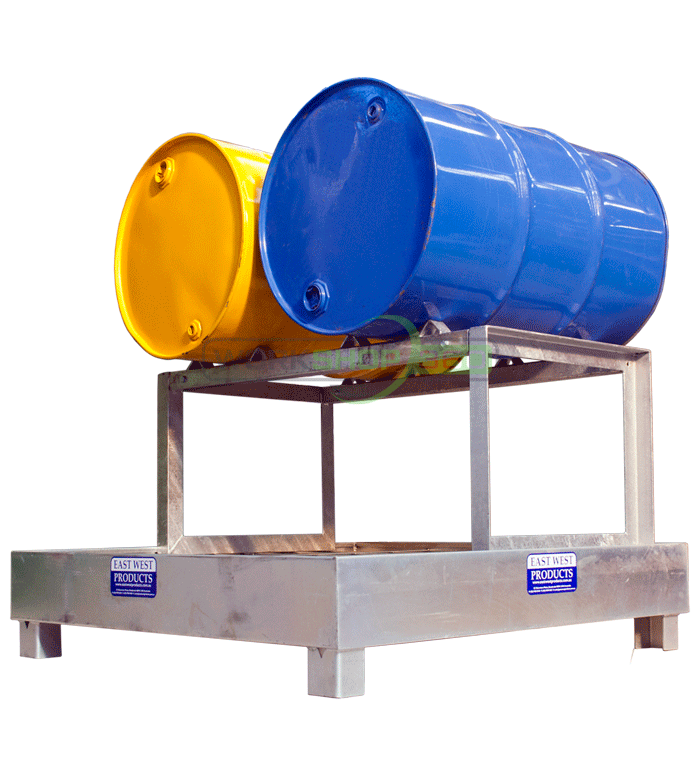 Drum rack is supplied 'flatpack' (for on-site assembly), along with the spill bin. Combined unit is simply bolted together.