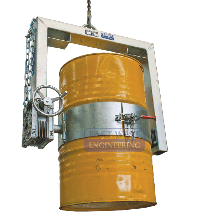 The DBR40H Drum Rotator is designed to lift and rotate a 205 litre steel drum 360° by overhead crane or forklift. Rotation of the drum is controlled throughout the operation by the handle driven gearbox which locks the drum in position when the operator stops turning the handle, preventing dangerous and uncontrolled movements.