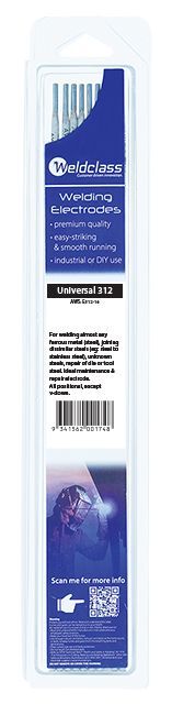 312 "universal" series weld-all style electrodes (welding rods) for welding almost any steel or stainless-steel, including dissimiliar metals. Re-usable pack with screw-top lid.