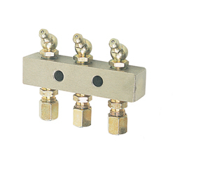 Header block 3 outlet c/w 6mm fittings and grease nipples