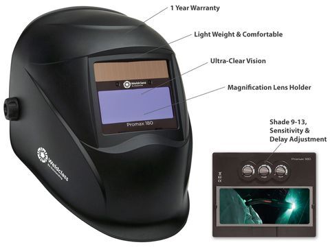 Exceptional value, no quality shorcuts. The PROMAX 180 electronic welding helmet is designed for occasional MIG & Stick Welding. Controls include Variable Shade 9-13, Sensitivity & Delay Adjustments. Designed & built to same demanding standard as our higher-end models. Comfortable, very lightweight & superior optics. Click on 'More Info' for a full list of features.