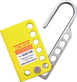 Stainless Steel Lockout Hasp with 7 padlock holes. Powdercoated Yellow or Red.