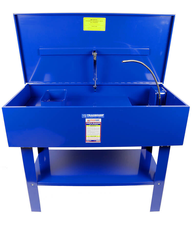 This top quality TradeQuip "Made for the Trade" Large Parts Washer is perfect for cleaning down most components prior to assembly. It is designed and manufactured to TradeQuip Quality Standards and has a very sturdy steel construction and quality enamelled finish. The "Quick Close" fire safe lid mechanism ensures operator protection in case of fire. The unit has a built in replacement cleaning fluid filter and easy maintenance 240V 'High Volume' cleaning fluid pump. Fitted with "Standards Australia Approved" 10Amp plug and cable.