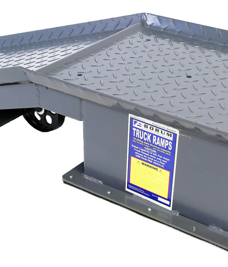 The Borum Industrial Portable Truck Ramp Set is designed for maintenance and servicing work on trucks, buses and forklifts allowing easy and safe access to the undercarriage of vehicles. Easy and safe to use with a 700mm incline and 500mm of horizontal deck with safety flange to prevent fork truck from rolling off the deck. These robust ramps weigh just under 80kg each and are fitted with a unique wheel mechanism which raises and lowers for easy manouevrability. These 463mm wide steel truck ramps feature non-skid bases and non-slip traction plates to keep the ramps and their load in place. Handle retracts for out of the way safety and storage. Sold in pairs.