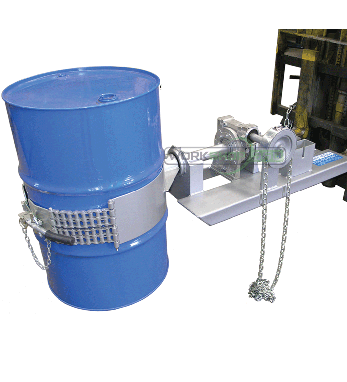 The SW-NC Sideways Drum Rotator is designed to lift a 205 litre drum at a sideways direction to the forklift and rotate 360 degrees. Rotation of the drum is controlled through the gear box via a hand chain, allowing the entire contents of the drum to be tipped.