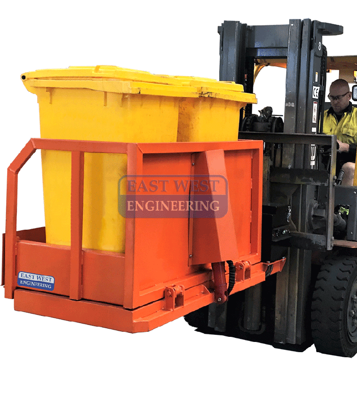 The FHB24 Sideways Wheelie Bin Tipper with fitted Hydraulic Power Pack is designed to safely lift, transport and empty wheelie bins of most sizes with a forklift.