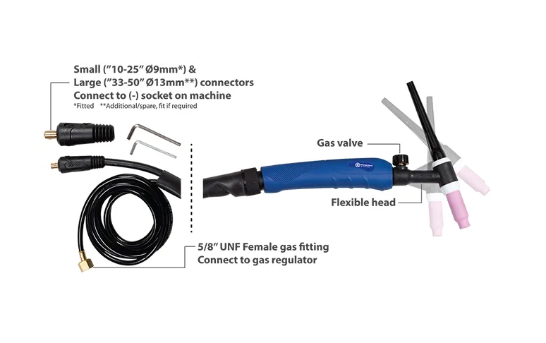 Quality European-made*, ready-to-weld 17FV series TIG torch package. Includes both small "10-25" and large "35-50" connectors to allow connection most standard 130A-250A inverter welders with TIG capability. Comes with valved flexible head, parts kit & tungsten electrodes. 150 Amp max capacity, use with tungsten electrodes up to 2.4mm, and for welding materials up to approx' 3mm thickness (depending on machine capacity/output).