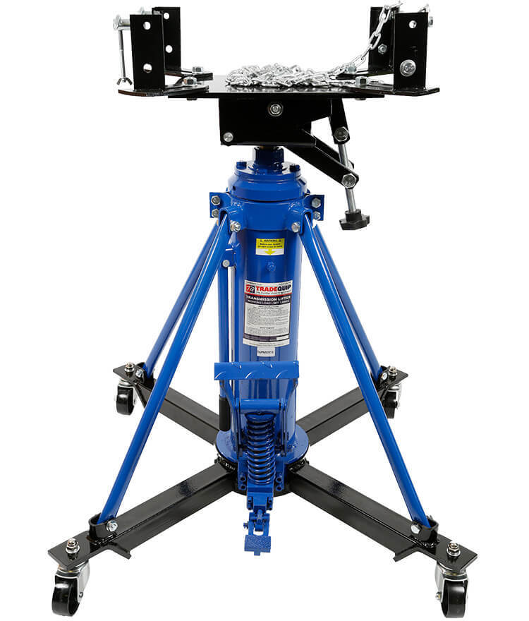 The TradeQuip "Made for the Trade" 1,000kg Transmission Lifter is designed for transmission installation and removal. It features a universal mounting cradle that provides a wide fore and aft tilt range and a manually operated hydraulic system with smooth hydraulic lift and descent. The hydraulic system also includes a bypass system to prevent over extension and accidental overloading. The sturdy and stable design offers safety and security when removing and installing large and heavy transmissions.