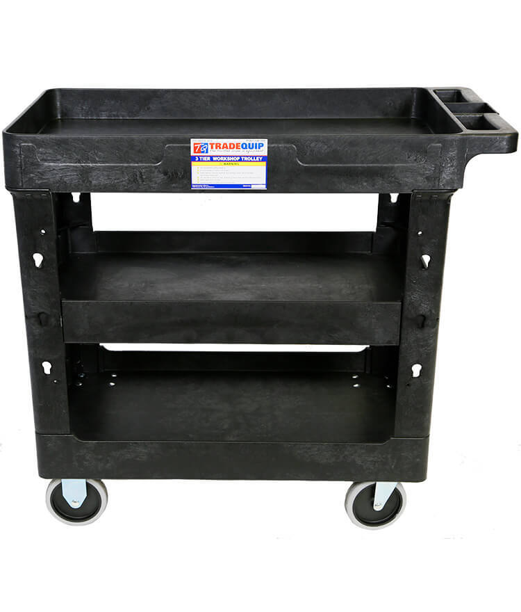 The polymer (heavy duty structural plastic) construction makes this three shelf TradeQuip "Made for the Trade" Workshop Trolley durable enough for moving tools and car parts. Easily handles loads up to 226kg. The rubber castors allow you to maneuver the workshop trolley without marring the floor. Deep shelves give you plenty of storage for your tools and parts. This is the perfect heavy duty workshop trolley for garages, warehouses and workshops.