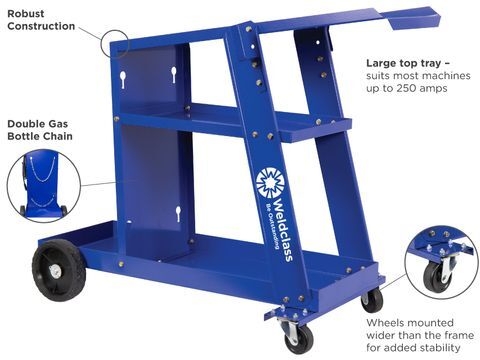 Robust welding trolley - the ideal platform for your portable welder or plasma cutter. Overall Size (mm): 1,000L x 720H x 420W (including axle). Size of top tray (mm): 700L x 275W.