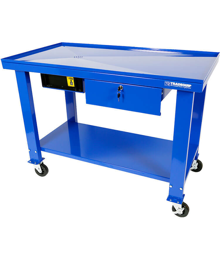 Fitted with adjustable work height, this workbench offers comfort and less back strain resulting in more productivity. The 14 gauge 1200 x 640mm table top has a 13mm rim that will contain all liquids. This work bench is fitted with a lockable drawer for security, alongside a removable (polyethylene) drain pan for convenience.