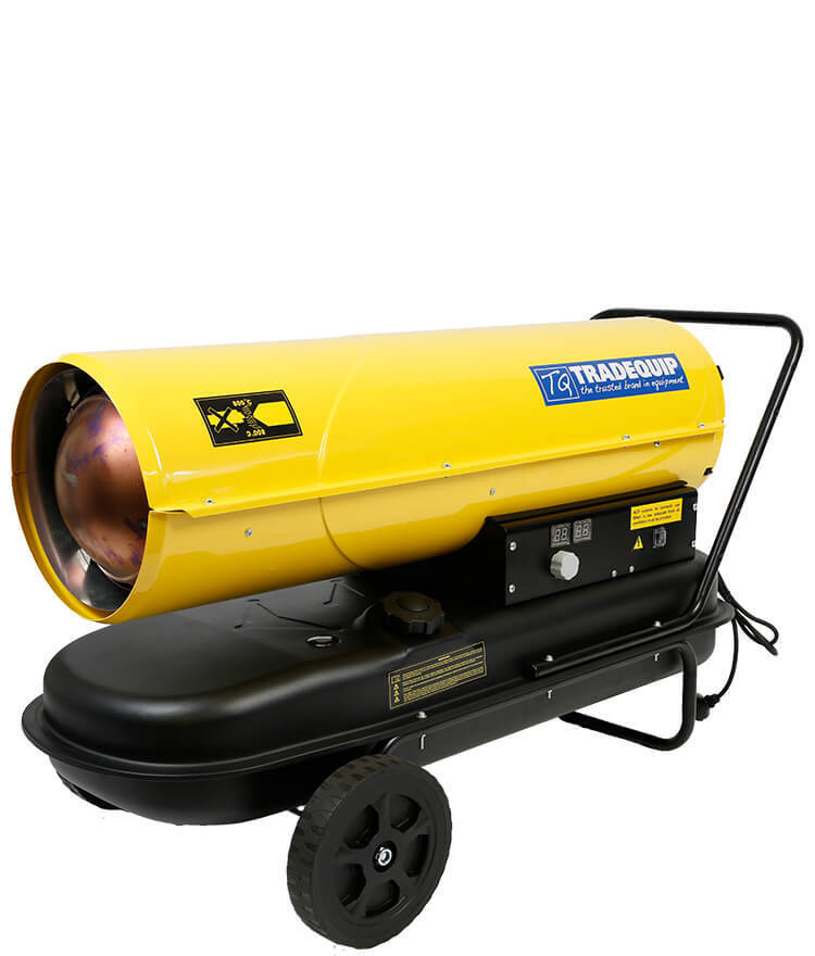This TradeQuip "Made for the Trade" Direct-Fired Forced Air Workshop Heater is ideal for workshops, garages and warehouses, reducing concrete freeze and emergency heating. The 56 Litre fuel tank can run for 9 hours on a single fill. It has on-board diagnostics and additional safety features. Ideal for quickly and efficiently heating cold condition workshops, this forced air heater can be used in a variety of commercial and industrial settings and is fueled by kerosene or diesel. It is a reliable heating solution for an area of approx. 415 square metres and is easy to move and position as required thanks to the ergonomically designed inbuilt handle.