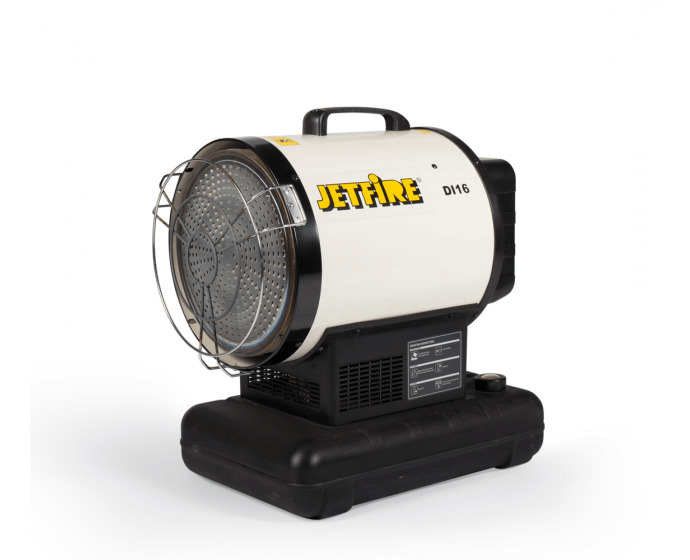• The JETFIRE DI16 Radiant Heat Diesel Area Heater is specifically designed to provide instant, reliable, and efficient heat to the industrial, commercial, agriculture and construction industries. This radiant space heater can heat any space up to 145m3 and produces a heat output of 16 kilowatts.